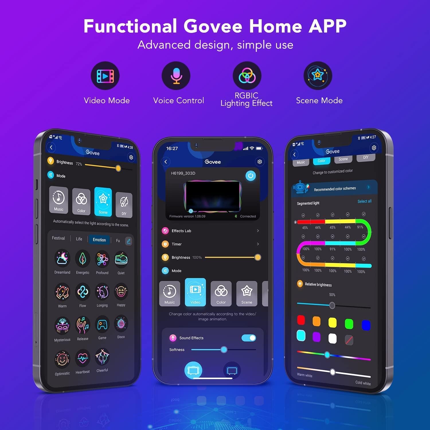 Smart Voice Control: Manage your LED lights for TV with simple voice commands, via Alexa and Google Assistant, or with the Govee Home app. Enjoy access to more colors and features like Timer, Video, DIY and Music mode, helping you create the ambiance you need.