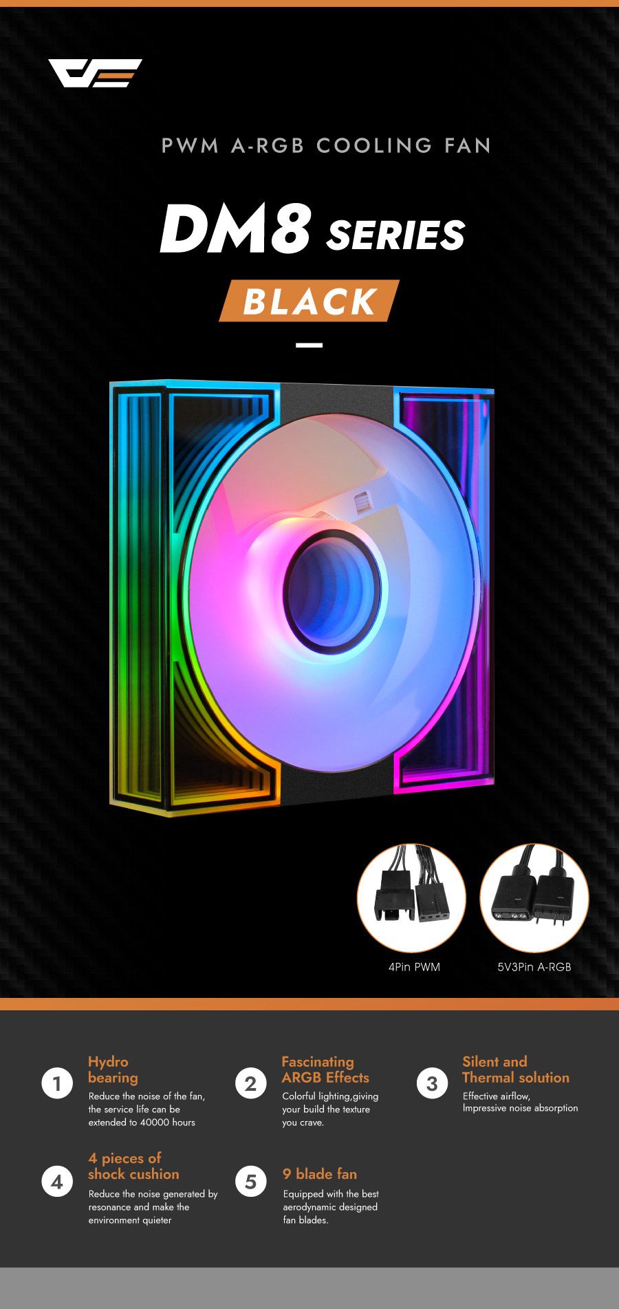 DARKFLASH DM8 SE | 3 IN 1 BLACK | 120 X 120 X 28MM | 4 PIN PWM | 5V3 PIN A-RGB | HYDRO BEARING | FASCINATING ARGB EFFECTS | SILENT AND THERMAL SOLUTION | 9 BLADE FAN | 6 MONTHS WARRANTY FANS